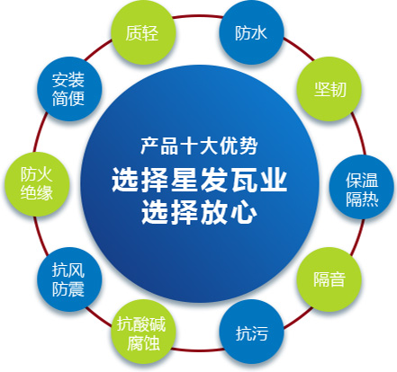 公司主要產(chǎn)品有《星發(fā)牌》合成樹脂瓦、APVC防腐耐候復(fù)合瓦、APVC發(fā)泡隔熱瓦、PVC半透明瓦、PVC防腐隔熱瓦、PVC防腐瓦、PVC防腐平板、PVC條紋板和ASA/PVC超耐候復(fù)合瓦等產(chǎn)品。產(chǎn)品一經(jīng)推出,已被廣泛應(yīng)用于國內(nèi)各類平改坡項(xiàng)目和大型工業(yè)項(xiàng)目,遠(yuǎn)銷歐洲、亞洲、美洲和非洲等國外市場,還獲選為廣州亞運(yùn)會、深圳大運(yùn)會、四川災(zāi)后重建等工程項(xiàng)目的應(yīng)用產(chǎn)品。公司在不斷創(chuàng)新和改革的基礎(chǔ)上,力求以更好的產(chǎn)品、優(yōu)良的服務(wù),用心、專心服務(wù)好每一個客戶。